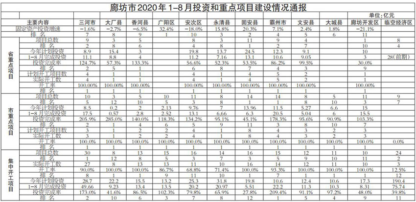 廊坊市2020年1-8月份投資和重點(diǎn)項(xiàng)目建設(shè)情況通報(bào)