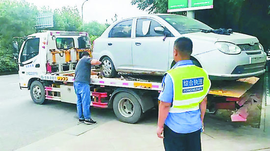 執(zhí)法隊員拖移無人問津的“僵尸車”。通訊員 鄭文輝 攝
