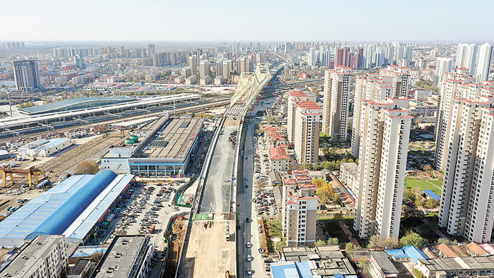 11月13日,光明道上跨鐵路橋項(xiàng)目引橋段全線箱梁架設(shè)任務(wù)全部完成?!独确蝗?qǐng)?bào)》記者 呂新穎 攝