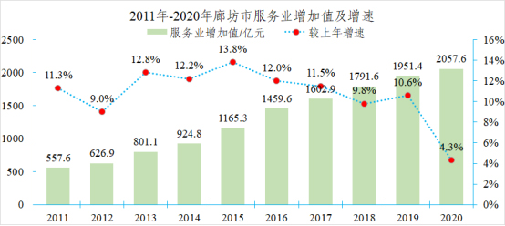 圖1-1 2011年-2020年廊坊市服務(wù)業(yè)增加值及增速
