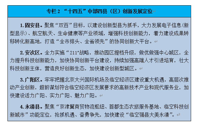 吸引京津高端創(chuàng)新資源,鼓勵(lì)有條件的縣(市、區(qū))與京津等國內(nèi)知名科技園區(qū)、科研院所、高等院校合作,采取一區(qū)多園、總部-孵化基地、整體托管等模式共建各類科技創(chuàng)新園區(qū)。加快推進(jìn)亦莊·永清高新區(qū)、中關(guān)村(大興)生物醫(yī)藥產(chǎn)業(yè)基地固安合作園、京冀通航產(chǎn)業(yè)園、固安航天科技產(chǎn)業(yè)園等科技合作園區(qū)建設(shè)。