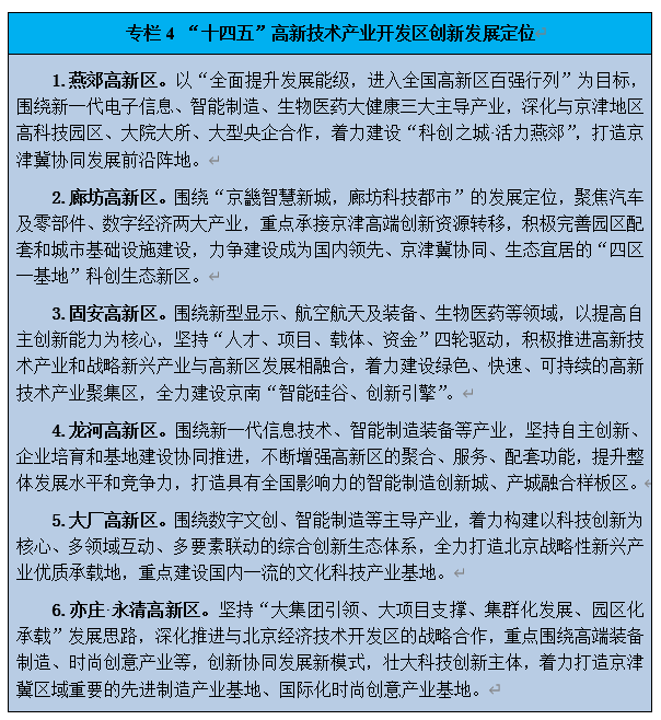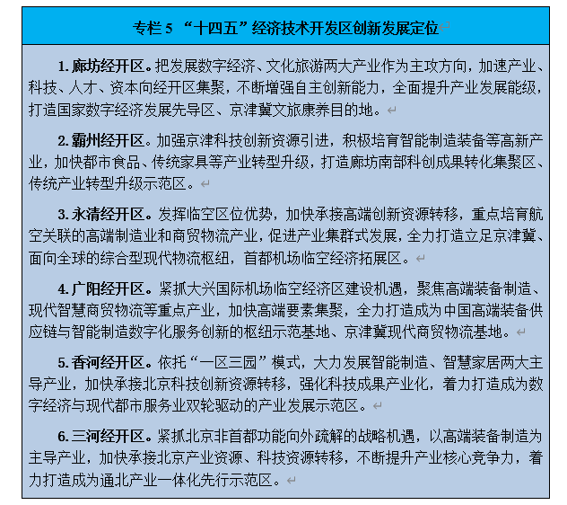 (一)推進(jìn)經(jīng)開區(qū)提檔升級。支持廊坊經(jīng)開區(qū)晉位升級,著力培育戰(zhàn)略性新興產(chǎn)業(yè)集群,發(fā)展高水平開放型經(jīng)濟(jì),“十四五”時(shí)期進(jìn)入全國經(jīng)開區(qū)前30名,邁入國家級經(jīng)開區(qū)第一方陣。支持霸州、永清、廣陽、香河、三河、大城、文安等省級經(jīng)開區(qū)加大招商引資力度,完善強(qiáng)化特色產(chǎn)業(yè)上下游鏈條,提升科技創(chuàng)新資源集聚度,不斷提升園區(qū)發(fā)展水平。
