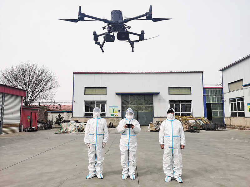 圖為安次公安分局特巡警大隊(duì)隊(duì)員利用無人機(jī)開展防疫工作。