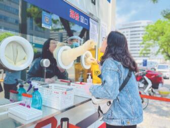 市民正在“零接觸”核酸采樣艙做核酸。?