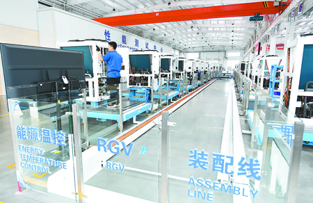 圖為7月11日,三河同飛制冷股份有限公司(同飛二期)生產(chǎn)車間內(nèi),工人正在能源溫控RGV裝配線上組裝溫控設(shè)備。
