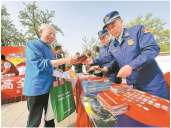 圖為志愿者向群眾發(fā)放消防安全手冊,講解消防安全知識。 記者 楊雅淇 攝
