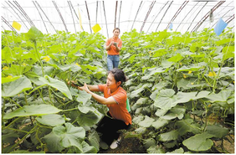 圖為在固安縣牛駝鎮(zhèn)順齋合作社,社員正在采摘水果黃瓜。記者 張春娥 通訊員 吳迪 張思琪 攝