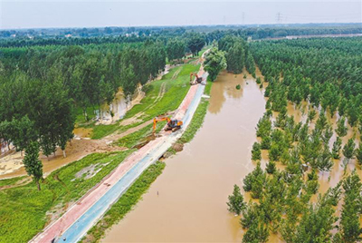 圖為永清縣永定青春公園內(nèi),大型機械正在進行抗洪搶險作業(yè)。