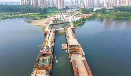 “大橋采用多種架梁方式,取決于不同位置的承重力和地質(zhì)條件等綜合因素?!表n鈺說,主橋整體采用鋼箱梁,引橋則由鋼混組合梁、現(xiàn)澆箱梁及裝配式小箱梁組成,跨左堤路主要采用鋼混組合梁。大橋河北段蓋梁共23個,目前,蓋梁施工已完成14個,占總量的60%,現(xiàn)澆箱梁完成50%。