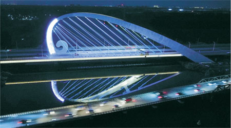 王家擺特大橋?yàn)橹骺?64.5米的空間異形鋼拱橋,采用抱翅型拱梁組合體系,由鋼主梁、斜拉索及“Λ”型鋼拱肋三部分組成,其中主梁高2.5米,全寬49.5米,總長(zhǎng)256米,由160塊總重達(dá)7700噸的鋼箱梁組成;主橋“如意”造型拱肋由24塊單塊重達(dá)200噸的節(jié)段組成,將如意的古典華美和運(yùn)河之水的奔流涌動(dòng)之態(tài)實(shí)現(xiàn)完美融合。