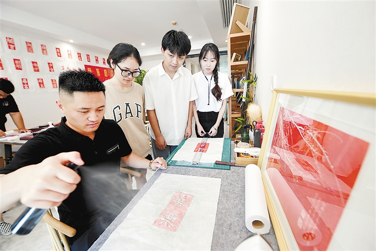 “這是我第一次體驗(yàn)拓印技藝,感覺非常新奇。店里不僅提供了‘觀?!犛辍雀挥性?shī)意的詞匯,還提供了‘上岸’‘少食’‘福來(lái)’‘立志’等在年輕人群體里廣受歡迎的詞匯,我和同學(xué)都很喜歡。通過這次拓印體驗(yàn),我領(lǐng)悟到中國(guó)傳統(tǒng)技藝的神奇之處,也深刻感受到中華傳統(tǒng)文化的博大精深?!笔忻癜蚕壬硎?。