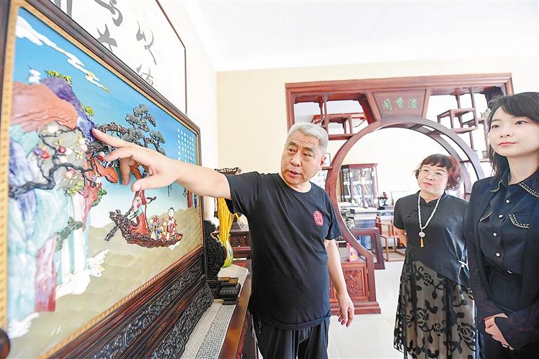 九州鎮(zhèn)南漢村非遺傳承人周洪俊為顧客介紹百寶嵌作品《麻姑獻壽》制作細節(jié)。 通訊員 孫寶宇 攝