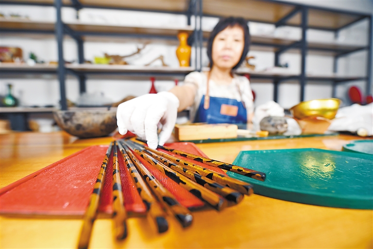 在村鎮(zhèn)的一個小型工作室,河北省級非遺項目金漆彩繪髹飾技藝傳承人劉秀娟正在仔細勾勒漆器上的圖案?!白鳛橐环N古老的漆器工藝,金漆彩繪髹飾技藝是以黑、黃、紅等漆胎為底色,從而展現作品的光彩。我在保持宮廷傳統工藝技法和藝術風格的同時,還將中國畫中的滃染、點暈、皴法等融入其中?!眲⑿憔暌贿吋氈鹿蠢展P下的圖案一邊說。