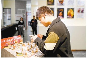 在永清縣核雕展覽館,游客欣賞核雕作品并拍照留念。 通訊員 韓信州 記者 劉磊 攝