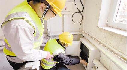 11月8日,在管道局第一生活區(qū),身穿灰色工作服的廊坊清泉供水公司工作人員手提工具箱穿梭在小區(qū)各單元之間。他們仔細檢查每個單元低樓層供水管道和水表箱保溫防護情況。