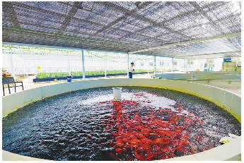 經(jīng)濟(jì)和生態(tài)的雙豐收,是“魚菜共生”模式的一大優(yōu)勢。養(yǎng)殖魚類產(chǎn)生的廢棄物,通過過濾和硝化系統(tǒng)可轉(zhuǎn)化成被植物吸收的無機(jī)氮肥。水培蔬菜利用根系強(qiáng)大的吸附能力,既充分利用了養(yǎng)魚的營養(yǎng)源,又減少了氨氮等污染物排放。