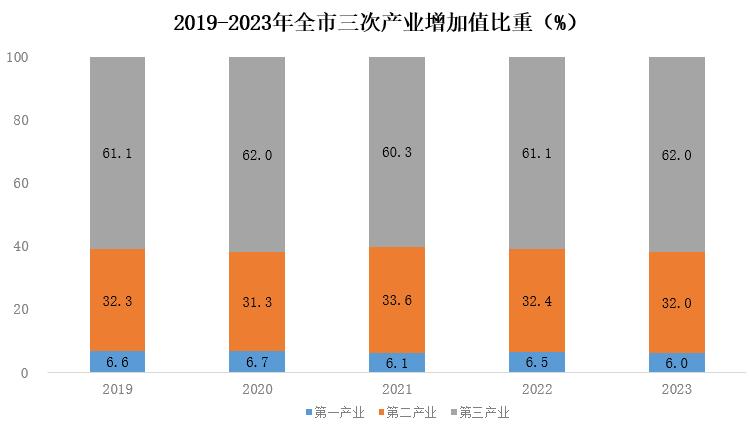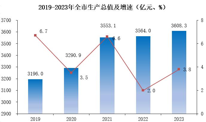 初步核算,全年全市生產(chǎn)總值3608.3億元,同比增長(zhǎng)3.8%。第一產(chǎn)業(yè)增加值217.9億元,下降2.9%;第二產(chǎn)業(yè)增加值1153.8億元,增長(zhǎng)7.2%;第三產(chǎn)業(yè)增加值2236.6億元,增長(zhǎng)2.7%。三次產(chǎn)業(yè)結(jié)構(gòu)為6.0:32.0:62.0。全市人均生產(chǎn)總值65763元,增長(zhǎng)4.3%。