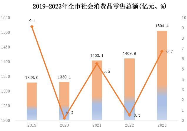 全年社會(huì)消費(fèi)品零售總額1504.4億元,同比增長(zhǎng)6.7%。分城鄉(xiāng)看,城鎮(zhèn)市場(chǎng)實(shí)現(xiàn)零售額1269.9億元,增長(zhǎng)6.4%;鄉(xiāng)村市場(chǎng)實(shí)現(xiàn)零售額234.5億元,增長(zhǎng)8.2%,鄉(xiāng)村市場(chǎng)增速快于城鎮(zhèn)市場(chǎng)1.8個(gè)百分點(diǎn)。