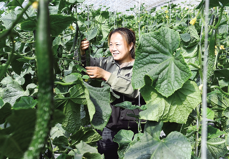 南趙扶鎮(zhèn)一家農(nóng)業(yè)示范基地的設(shè)施大棚內(nèi),農(nóng)民在采收黃瓜。
