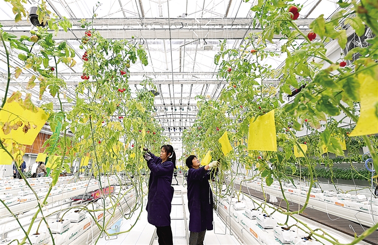 該基地應(yīng)用農(nóng)業(yè)物聯(lián)網(wǎng)技術(shù)監(jiān)測(cè),讓種植透著“智慧味”。打開手機(jī)APP,輕觸屏幕,一排排云端懸掛式草莓栽培間隔式緩緩升起,工作人員穿梭其間輕松作業(yè)。在智慧溫室內(nèi),水肥一體化番茄種植、植物工廠等區(qū)域有序分開,一株株蔬菜綠油油、水靈靈。