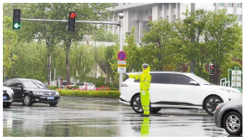 大雨突襲廊坊城區(qū),部分路段積水深度超安全標(biāo)準(zhǔn),個別低洼區(qū)域積水甚至漫過車輪,車輛在積水中緩行,交通秩序一度緊張。廊坊交警全員上崗,冒雨奔赴各重點(diǎn)路段、易擁堵路口、高速路。對過往車輛,他們通過手勢引導(dǎo)、喊話提醒等方式,有序疏導(dǎo)車流,避免出現(xiàn)交通擁堵和事故;同時,在危險路段提醒駕駛員謹(jǐn)慎通行,為市民出行筑牢安全屏障。
