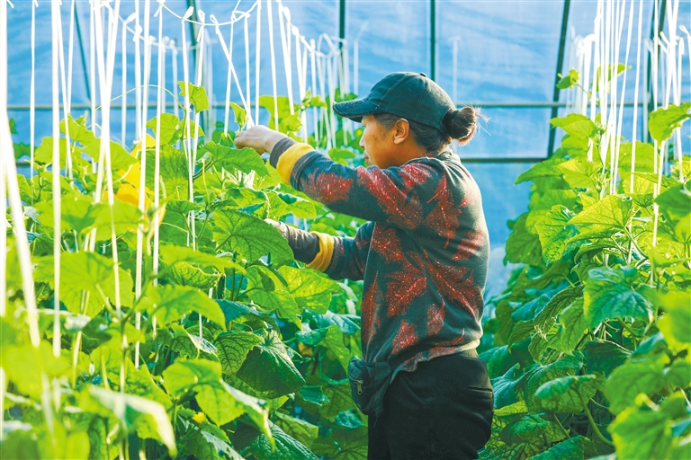 永清縣龍虎莊鄉(xiāng)大青垡村,農(nóng)戶管護(hù)大棚黃瓜。 記者 王靜 通訊員 龐趁友 鄭亞彬 攝