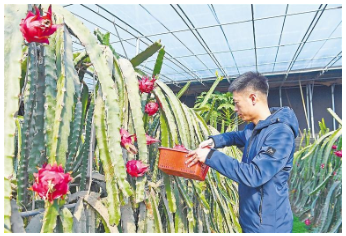 圖為在大城縣旺村鎮(zhèn)一設(shè)施大棚內(nèi),游客在采摘火龍果。