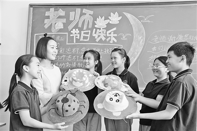 為迎接教師節(jié)的到來(lái),永清縣第五中學(xué)舉行“說(shuō)聲‘老師辛苦了’”主題活動(dòng),表達(dá)對(duì)老師的節(jié)日祝福。圖為9月7日,該校的馬亞娜老師(左二)課間感受到了一份驚喜,學(xué)生們手拿親手繪制的“草帽畫”,向老師道一聲“老師辛苦了”。