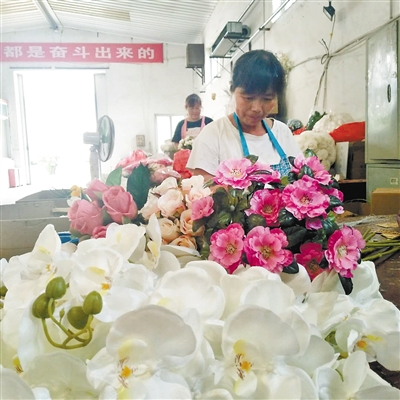 記者在基地操作車(chē)間看到,工人們正忙著制作、包裝各種仿真花。進(jìn)入銷(xiāo)售旺季,訂單不斷,大伙兒干得也很起勁。
