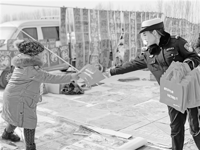 圖為民警將宣傳材料送到群眾手中。 記者 劉艷芳 攝