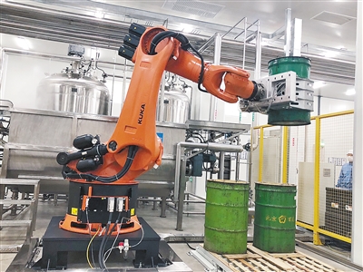 走進(jìn)廊坊百花蜂產(chǎn)品有限公司生產(chǎn)車間,只見一臺(tái)“投料機(jī)器人”伸出長(zhǎng)臂,攤開“手掌”,靈活地把蜂蜜桶抬向空中,再把桶翻個(gè)個(gè)兒,將桶內(nèi)的蜂蜜精準(zhǔn)投放至原料槽內(nèi),隨后把倒完蜂蜜的桶放回空桶區(qū),全流程一氣呵成。