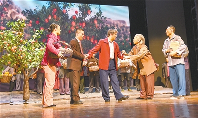 “‘把農(nóng)民變成我,把我變成一個(gè)老農(nóng)民’這句話感人至深”“令我印象深刻的是最后一幕,崗底村民捧著熟透的蘋(píng)果送李保國(guó)離開(kāi)”“除夕夜,李保國(guó)和妻子吃方便面的情節(jié)讓我感觸頗深”……這出戲,讓人記憶深刻的情節(jié)比比皆是??粗枧_(tái)上的表演,觀眾叫好聲此起彼伏,情到深處數(shù)次潸然淚下。