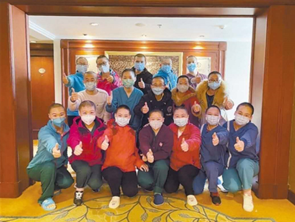 “第三次理發(fā)最‘慘烈’。雖然剪了兩次,但還是感覺太長了,卷成一團(tuán)頂在頭上,還是會增加感染風(fēng)險。于是大家一致決定,剃成光頭。”宣園園說,因為志愿者不能進(jìn)入酒店,她們只得借了志愿者的理發(fā)器自己動手。大家你幫我,我?guī)湍?,就這樣,這群年輕的“戰(zhàn)士”全部剃成了光頭。