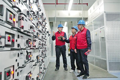 圖為國網(wǎng)廊坊供電公司員工詳細了解重要場館的饋電柜運行情況。
