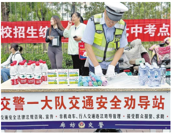 交警為考生和家長準(zhǔn)備應(yīng)急物品。本報(bào)記者 盛嘉敏 攝