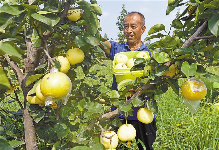圖為在平舒鎮(zhèn)杏園村水果種植基地,農(nóng)戶正在采收皇冠梨。