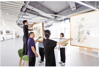 圖為永清縣益田翰德學(xué)校內(nèi),工作人員正在布置戲曲主題展館。?