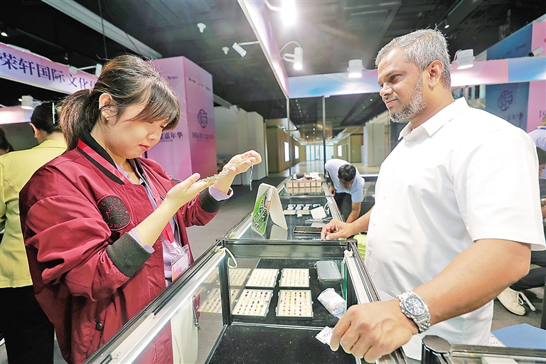 圖為在國際珠寶嘉年華國際展區(qū),斯里蘭卡參展商向顧客介紹產(chǎn)品。 記者 陳童 攝