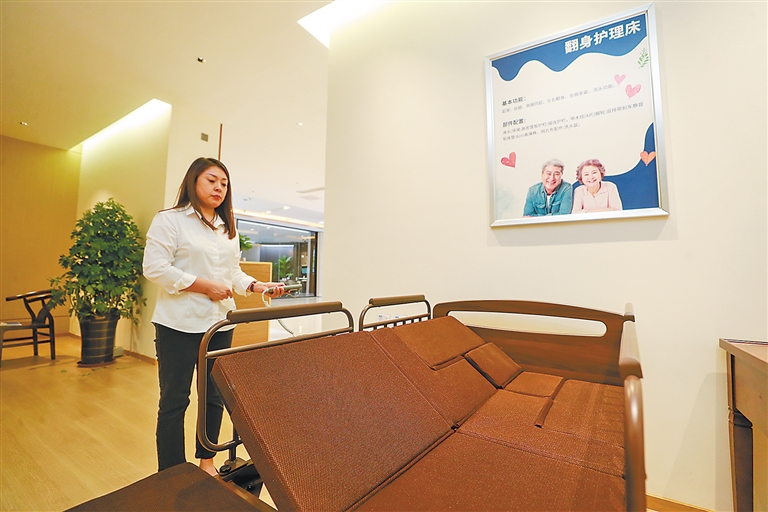 在香河金鑰匙家居城海爾智慧康養(yǎng)體驗(yàn)中心,工作人員演示失能老人護(hù)理床。