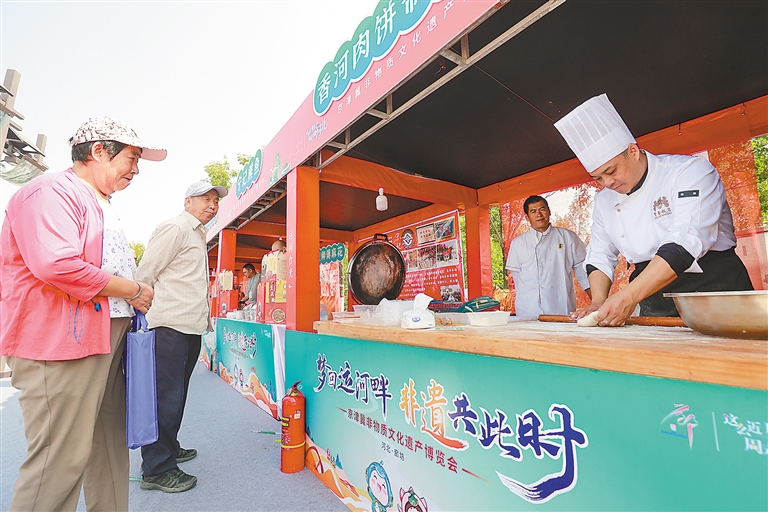 京津冀非物質(zhì)文化遺產(chǎn)博覽會(huì)上,游客在香河肉餅展位近距離感受傳統(tǒng)美食魅力。