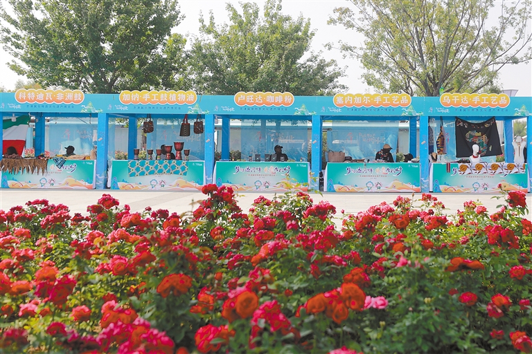 京津冀非物質(zhì)文化遺產(chǎn)博覽會(huì)烏干達(dá)手工藝品展位前,游客與工作人員合影留念。
