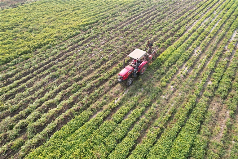 在大城縣廣安鎮(zhèn)花生種植基地,農(nóng)民駕駛農(nóng)機(jī)收獲花生(無人機(jī)照片)。