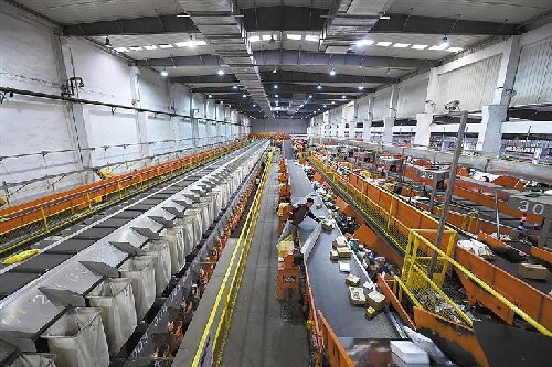 在永清縣圓通速遞北方總部基地華北集運中心內(nèi),工人正在全自動分揀流水線上作業(yè)。