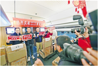 圖為乘坐首趟列車的乘客合影留念。 記者 劉向 攝