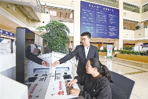 在香河縣北京城市副中心政務(wù)服務(wù)中心一體化辦事大廳內(nèi),工作人員正在為市民辦理業(yè)務(wù)。