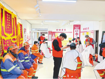?理發(fā)師為環(huán)衛(wèi)工人修剪頭發(fā)。