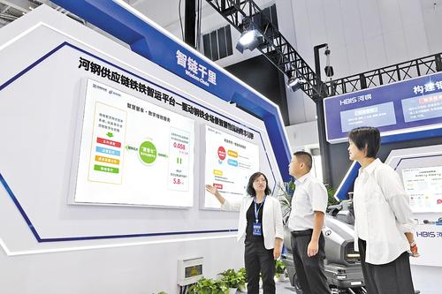 6月16日,觀眾在2025年廊坊經(jīng)洽會(huì)智慧物流技術(shù)與裝備展區(qū)內(nèi)參觀河鋼供應(yīng)鏈鐵鐵智運(yùn)平臺(tái)。