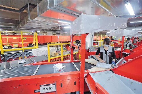 位于廊坊開發(fā)區(qū)的廊坊順豐速運(yùn)有限公司華北分撥區(qū)廊坊開發(fā)區(qū)中轉(zhuǎn)場內(nèi),工作人員分揀快遞。