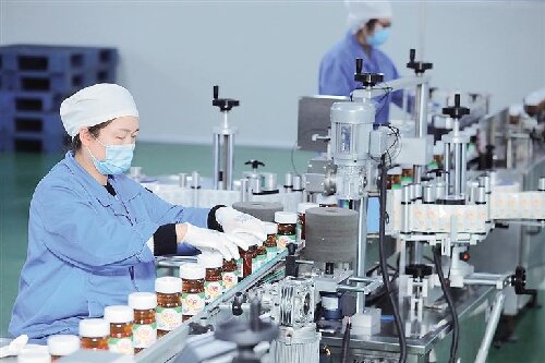 廊坊百花蜂產(chǎn)品有限公司工作人員在包裝車間流水線上工作。