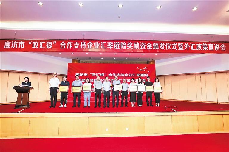 為進一步提升我市企業(yè)匯率風險管理能力,持續(xù)深入推進跨境貿(mào)易投資便利化進程,增強服務(wù)實體經(jīng)濟質(zhì)效,國家外匯管理局廊坊市分局聯(lián)合市財政局、人行廊坊市分行共同舉行了全市企業(yè)匯率避險獎勵資金頒發(fā)儀式暨外匯政策宣講會。